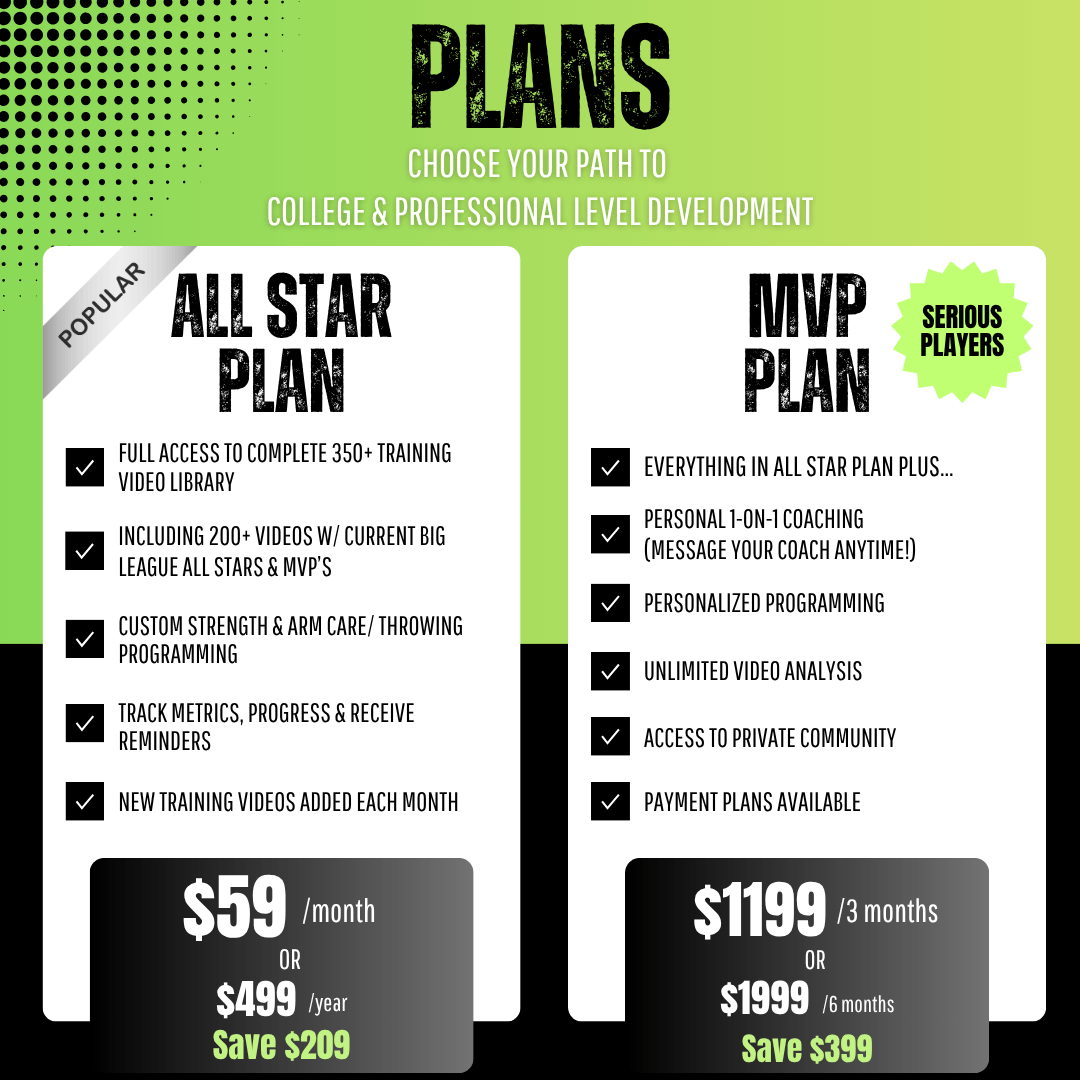 Both! You can choose our All Star Plan for full access to the training library and customized programs with different calendars to follow, or upgrade to our MVP Plan for hands-on, personal coaching, video analysis, and personalized programming designed specifically for you.